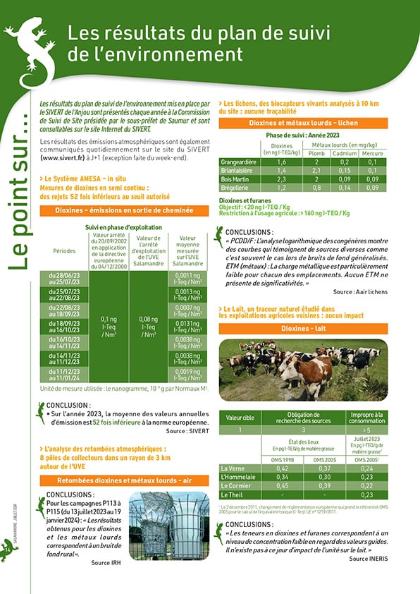 Les derniers résultats du plan de suivi de l’environnement sont systématiquement communiqués deux fois par an grâce au journal Salamandre, distribué à l’ensemble des foyers du territoire du SIVERT.