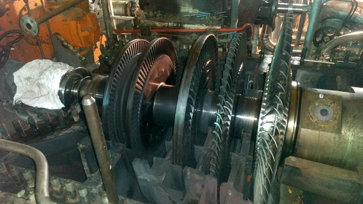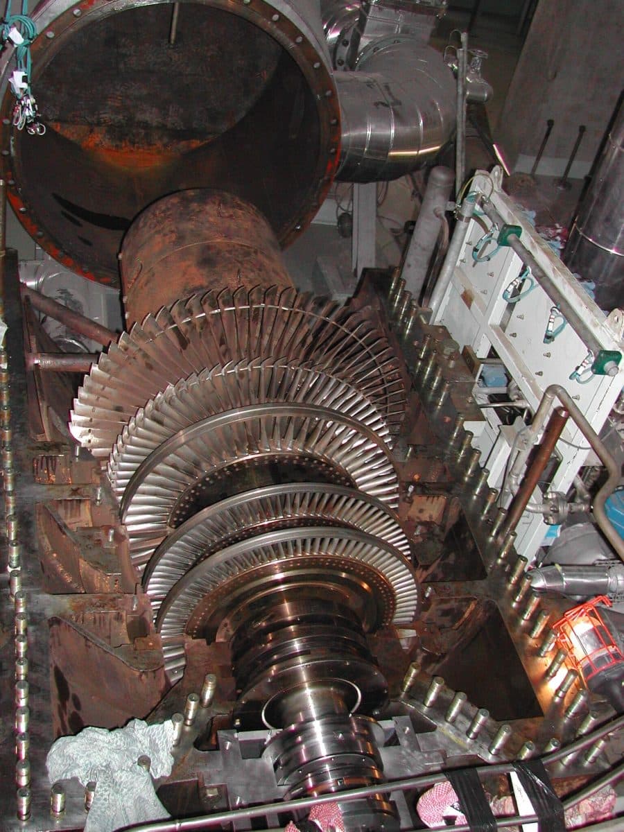 La turbine alimentée par les vapeurs sous pression issues de la chaudière située au-dessus du four produit de l’électricité pour le fonctionnement de l’Unité et pour le réseau électrique local.