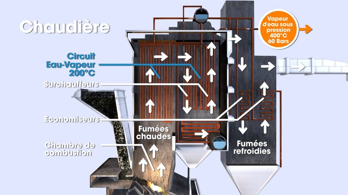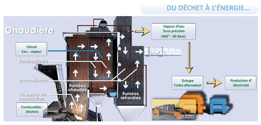 Grâce à la chaleur issue de la combustion des déchets, l’eau de la chaudière est transformée en vapeur. Celle-ci est projetée sur la turbine, qui entraine un alternateur. Environ 78 % des déchets sont ainsi transformés en électricité.