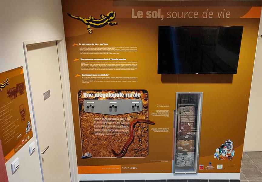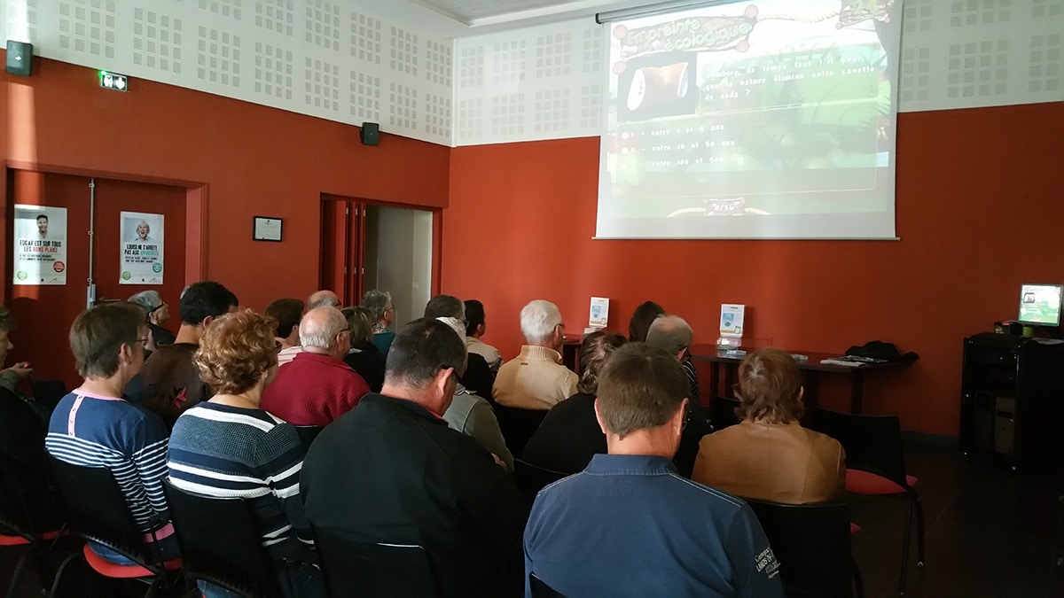 Dès leur arrivée, les visiteurs, munis de leur propre boîtier de vote, sont invités à calculer leur empreinte écologique grâce à un jeu interactif dans lequel La Salamandre, figure emblématique du SIVERT, guide chaque joueur et anime les questions. Ce jeu pédagogique a été conçu en partenariat avec l’ADEME.